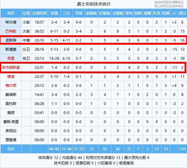 头号罪人(波杰姆斯基):全场4中1仅仅只有2分2篮板4助攻,正负值-9全队倒数第一,只要他一上来勇士就无法得分,第四节前半段就是他在场上主控,勇士落后两位数,搞不懂这么糟糕的球员凭啥获得勇士替补第一多出场时间!