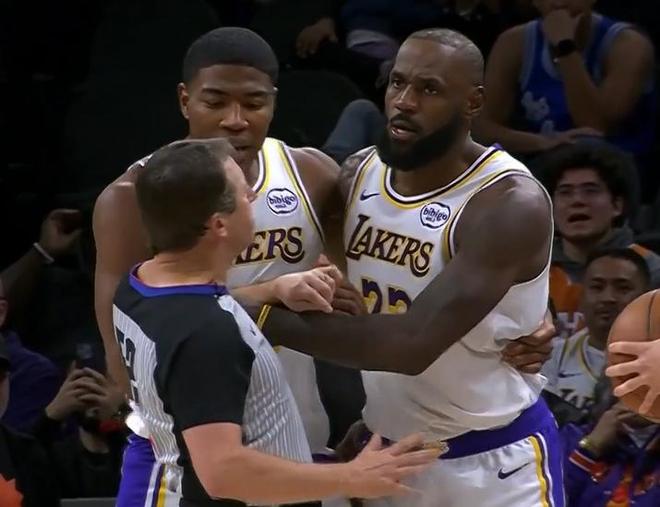 无论是挡拆后空切还是卡位抢板,只要两人对上位,互喷垃圾话和肢体碰撞必不可少。第三节前段,詹姆斯破坏狄龙的进攻,后者接着把球拍到了前者身上。29岁的狄龙成功激怒了月底快年满41周岁的老詹。“老汉”抓着裁判的左手索要说法,吓得队友八村塁紧紧抓着他防止矛盾激化,几名安保人员也站在左右,好在冲突没升级。