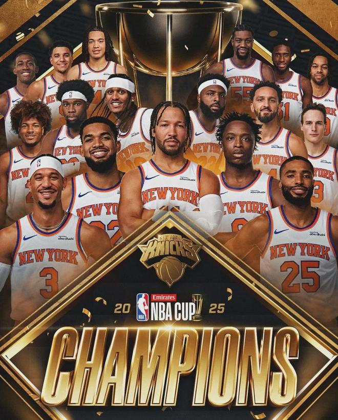 布伦森末节稳定控球,把时间耗尽,尼克斯最终是以124比113击败了马刺,拿到了本届NBA杯赛的冠军。
